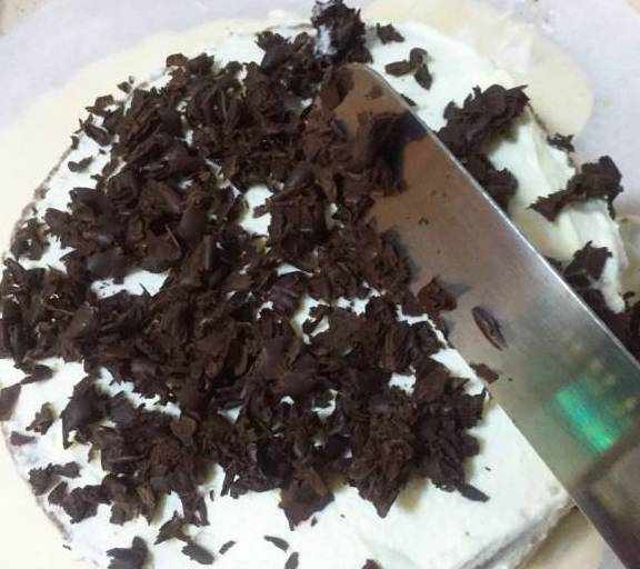 第18步、將德芙黑巧克力隔著袋子拿在手上,用水果刀像削鉛筆那樣削出許多小片片。蛋糕上面的巧克力碎可以直接削落,四周可以用抹刀將巧克力碎貼上去。千萬不要用手,夏天巧克力遇手就容易融化粘在一起。