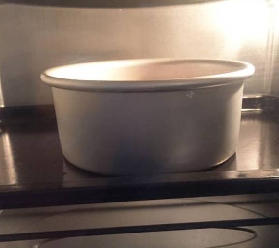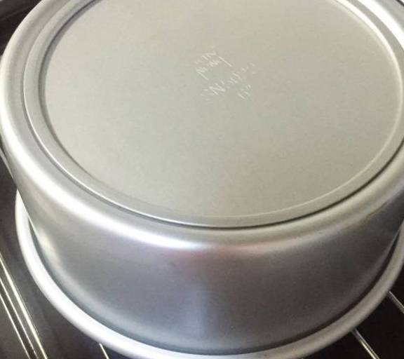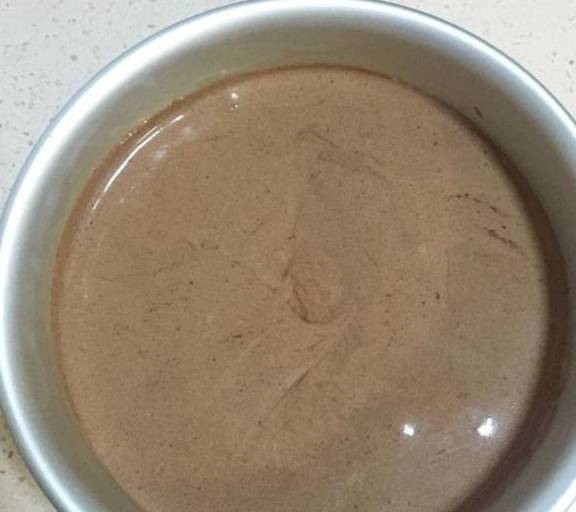 第9步、將混合好的液體裝入6寸圓形蛋糕模中,輕輕振幾下排空氣
