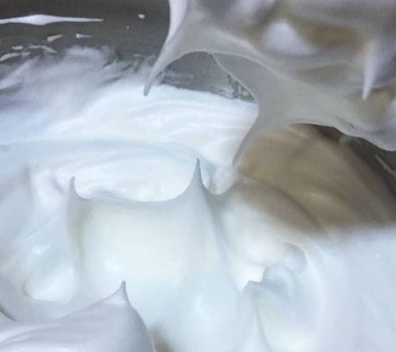 第7步、打到提起打蛋器有直立尖角的幹性發泡為止,全程約1-2分鐘