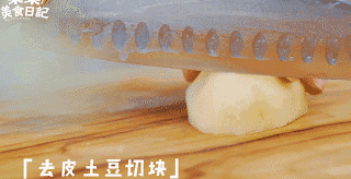 3.醃魚階段制作蔥香土豆,將土豆去皮切成小塊,小蔥切碎,蒜頭切片