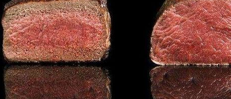 左邊是普通煎牛排,右邊是低溫慢煮牛排