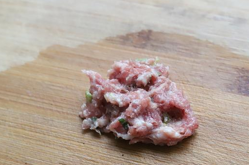 1,一點五花肉,很少的一小塊就可以,大約二三十克的樣子,剁碎瞭,加入一點鹽,料酒,小蔥碎,攪拌均勻備用。
