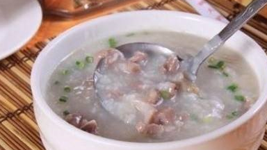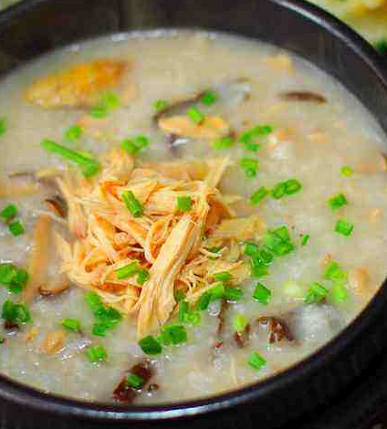 2.鍋內放油燒熱,炒香薑絲與鴨絲,把雞湯、糯米放入鍋中,煮開後轉小火煮到米湯濃稠,加鹽、冰糖煮10分鐘。熱量358千卡