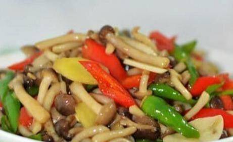 1、蟹味菇去根,洗凈瀝幹水分待用;將青紅椒斜切成斜片,普丁切成小片;