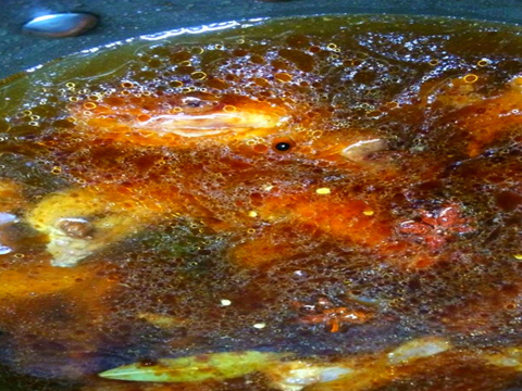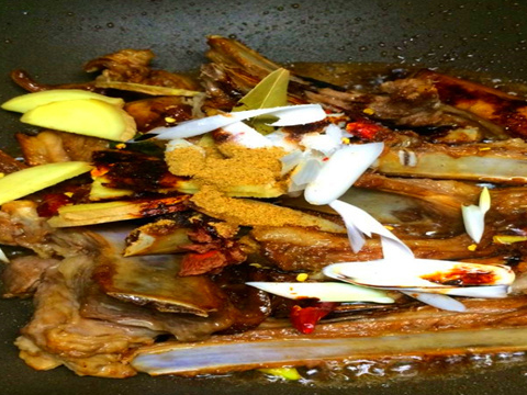 3、鍋內放少許油燒熱,然後放入冰糖融化成微紅色,然後放入小羊排翻炒。羊排變顏色,加入料酒,老抽等翻炒均勻。