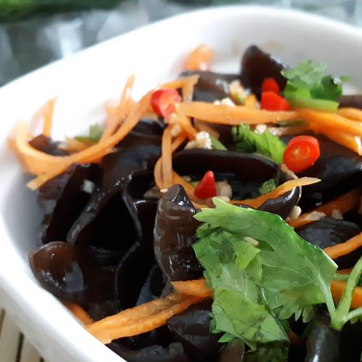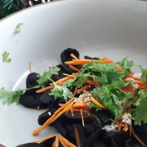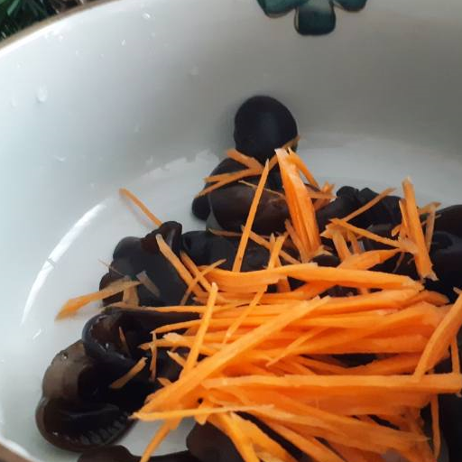原料:木耳、胡蘿卜絲、香菜末、香油、味精、鹽、生抽、醋、糖、小米辣、胡椒粉、蒜末。
