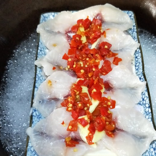 第9步、把泡椒也鋪入魚片表面,置入燒開水的鍋中,大火蒸5~6分鐘。