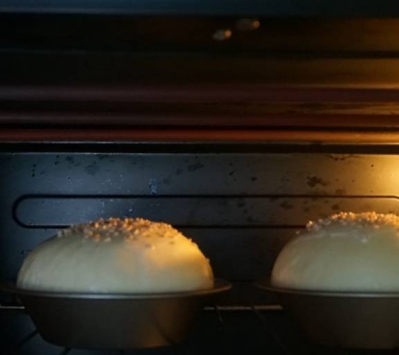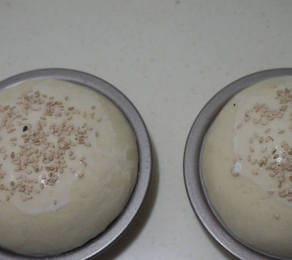 第8步、待面坯是原來的2倍大時,表面抹一層牛奶,再撒少許白芝麻;如果想要表面亮亮的,可以刷一層雞蛋液;此時烤箱開始預熱180度