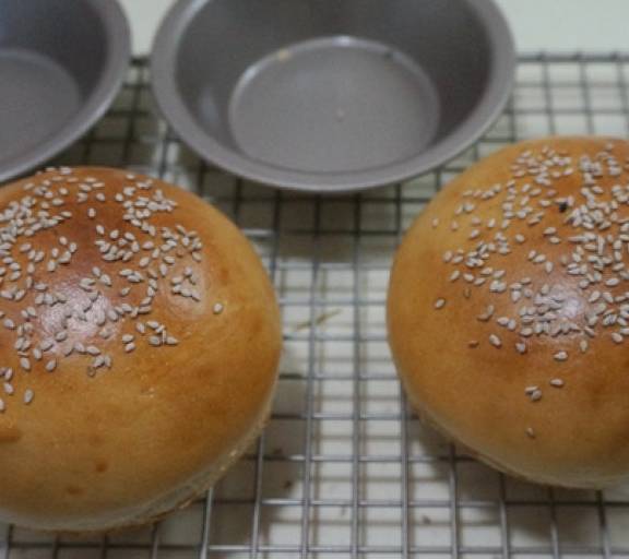 第9步、將漢堡生胚送入預熱好的烤箱中層,180度,上下火,18分鐘左右,上色到滿意程度時,可以加蓋錫紙