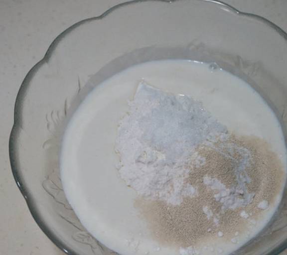 第2步、先把白糖、牛奶入大碗中,再倒入面粉、酵母