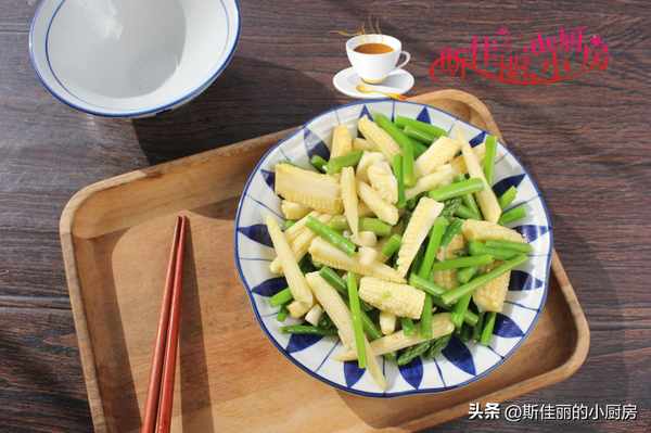 制作: 燒鍋水加入少許油和鹽,將整根蘆筍放入鍋中焯燙變色後撈出切成小段備用; 再將玉米筍放入鍋中煮至八成熟後撈出備用;燒熱鍋放入少許油, 加入1小勺蒜末爆香,加入玉米筍和蘆筍進鍋翻炒幾下,再加入少許鹽調味,最後加入適量的水淀粉勾芡即可。