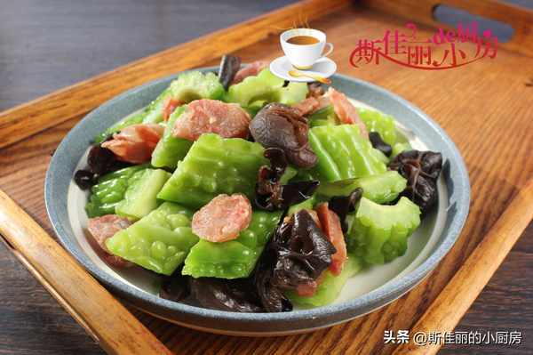 制作:將黑木耳用冷水泡軟備用; 燒鍋水加入少許鹽和油,將苦瓜片和泡軟的黑木耳放進鍋中煮至八、九成熟後撈出備用;熱鍋涼油, 將香腸片放入鍋中煸炒,再加入少許水將香腸燜煮三分鐘後再煎出少許油脂,加入焯好的食材進鍋繼續翻炒兩下,最後加入1小勺鹽調味翻炒均勻即可。