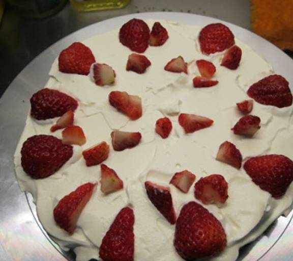 第21步、抹上一層打發的淡奶油擺上切好的草莓