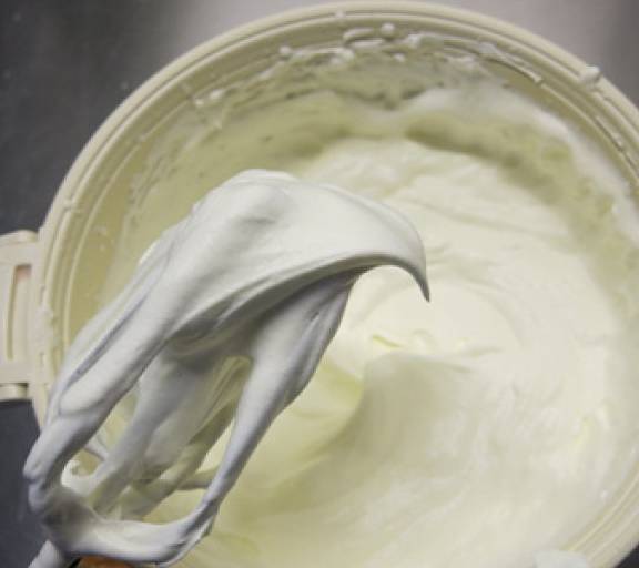第18步、淡奶油加入10%的細砂糖打發至帶彎鉤的狀態。