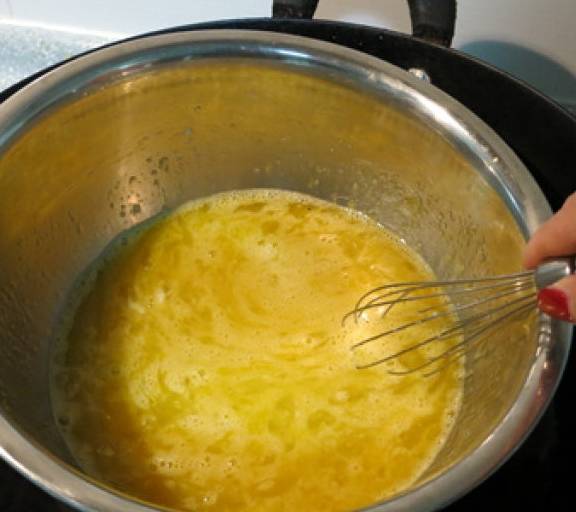 第7步、取一個鍋,鍋裡放入冷水,把打蛋盆坐在水小火加熱,邊加熱邊攪拌,待到蛋液的溫度達到40度,用手試一下略高於體溫時,將盆移開。
