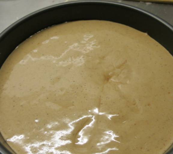 第14步、把拌好的蛋糕糊全部倒入模具,端起來在臺面上用力震幾下,可以讓蛋糕糊表面變得平整,並把內部的大氣泡震出來。