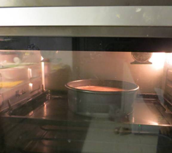 第15步、把模具送入預熱好180度的烤箱,烤35分鐘,用牙簽插入蛋糕內部,拔出來後牙簽上沒有粘上蛋糕,即可出爐瞭。