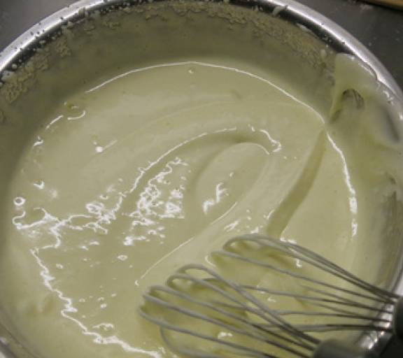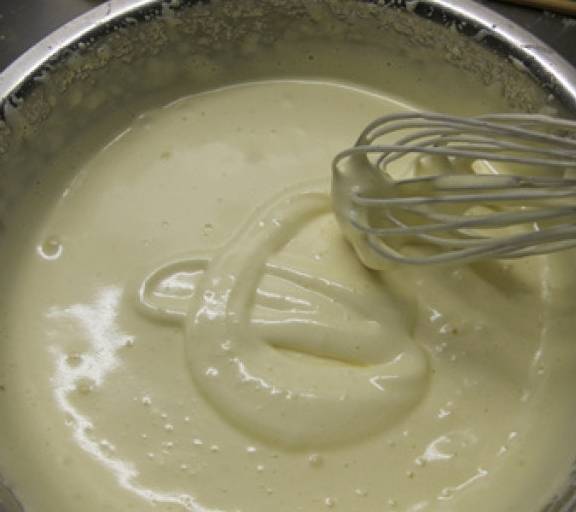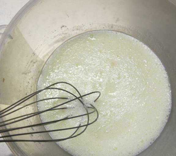 第4步、放在容器裡的奶和油用手動打蛋器攪至乳化