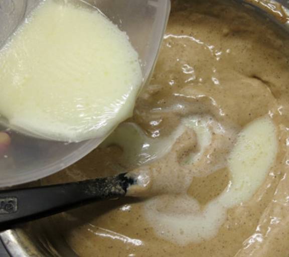 第12步、在攪拌好的蛋糕糊裡淋入乳化的油奶液