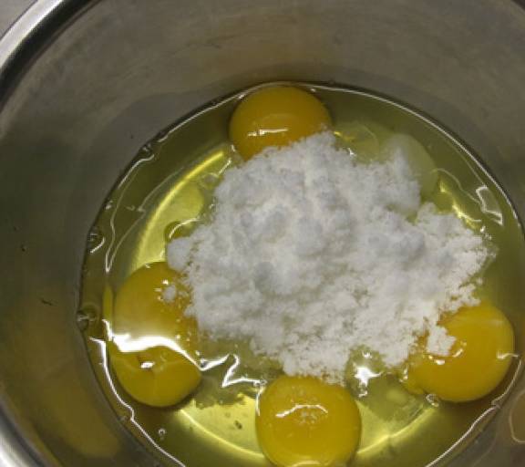 第1步、主料:雞蛋4個可可粉15克色拉油37克牛奶66克水怡15克低粉160克糖120克準備材料,雞蛋提前從冰箱拿出回溫,稱好糖,面粉過篩,色拉油和奶放入容器