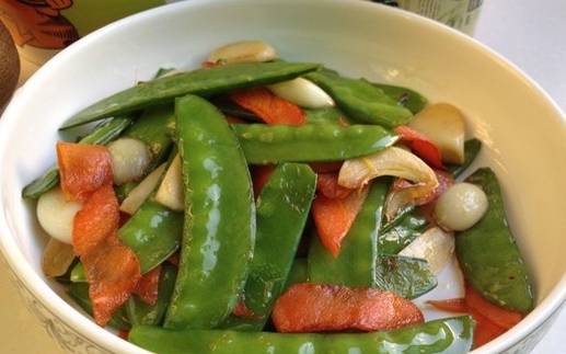 清炒荷蘭豆。炒的不要太熟,吃的時候還有點脆脆的口感最好,也不放過多的調料,放點油鹽生抽,保留瞭最原始的味道,感覺有水果的味道。