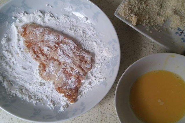 在雞排上撒上適量淀粉,再加入兩個雞蛋,用手拌勻,放入油炸粉(或面包糠)中來回翻滾,使兩面都裹上一層料,放在一邊備用。