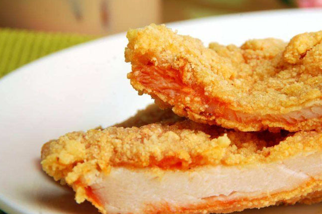 鍋中放入500g食用油,大火燒至6-7成熱,轉小火下加工好的雞排,炸至表面起酥金黃,撈出瀝油,切成小塊配上醬料就可以上桌瞭。