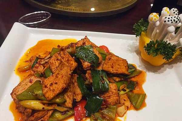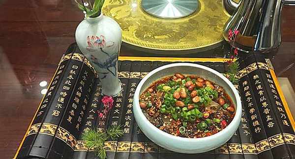 花間一壺酒。在珍肴異饌的杭幫菜面前,食客頓生穿越之感,仿佛來在江南水鄉賞花賞湖,提箸小酌。單看兩道涼盤老西涼粉兒和泡椒鳳爪吧,老西涼粉兒用的古香古色的《三字經》竹簡狀托盤,點綴著松竹梅歲寒三友,將文人雅士追求慢生活的意境表達的淋漓盡致,讓人在淺斟慢飲間體驗博大精深的中國文化。泡椒鳳爪,擺盤精致,用一盞“涼膳房”的紅燈籠做點綴,怎一個雅字瞭得。兩款小菜猶如寫意國畫,江南的韻味就進這小品裡。