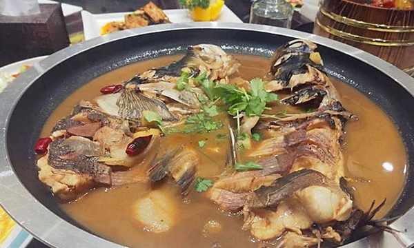 魚頭泡餅,同樣是杭幫菜的經典菜,采用千島湖野生魚頭,充分去除瞭魚的腥雜味,肉質鮮嫩,魚唇、魚臉,膠原豐富。魚眼、魚腦別具風味。尤其再把剛出鍋又脆又香的烙餅放入盤中,蘸著滋味濃鬱的魚湯吃,一個字,爽。
