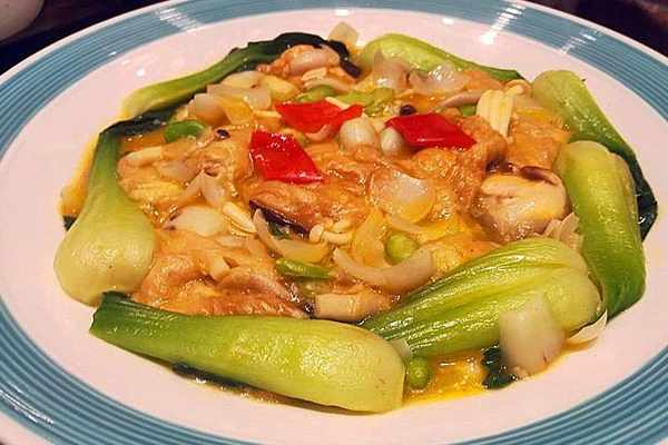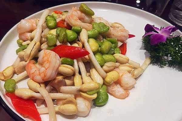 龍井蝦仁是杭幫菜經典范例,移植過來後,龍井茶調整為北方人喜歡的花生芽喝青豆,此菜看上去如小傢碧玉,清秀典雅;味之清淡,但不失鮮美;肉質滑嫩緊實,配上清淡的花生芽和青豆真是一絕。