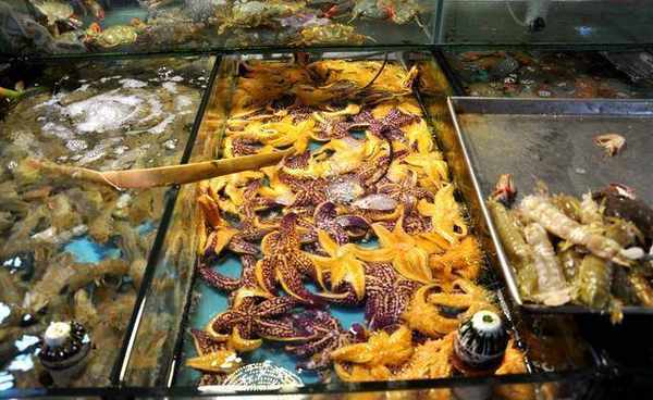 在專業海鮮店裡,攤主將一部分海星暫養起來,攤主老板介紹,海星非常扛“死”,打氧放幾天都沒事,外表呈現紫黃色,煮熟後掰開四條大腿裡面的肉其實不多,當地人也沒有吃海星的習慣,所以買的人不是很多,大部分是“好奇”買些嘗嘗,一般旅遊景區有零售商販煮熟後賣價4~5元一隻。