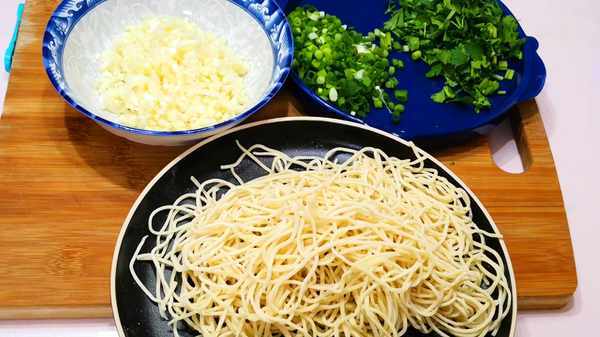 先準備所需食材:面條1斤、鹽、植物油、胡椒粉、辣椒面、白芝麻、香菜、小香蔥、大蒜各適量