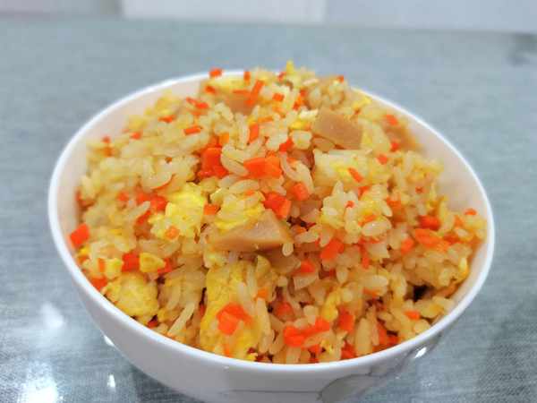 晚上預約好米飯,早晨就用熱米飯炒,非常的快速簡單,今天的炒米飯裡面放瞭一根火腿腸,孩子買回來火腿,放著卻不吃,就給炒米飯瞭。