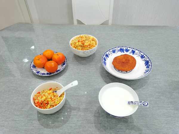 雞蛋蔬菜炒米飯,熱牛奶,自制油餅,水果是炫蜜桔。