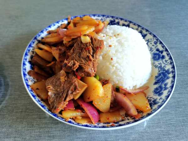早晨起床把土豆切片,先放煮鍋裡焯水,炒鍋裡熱油,放熟牛肉片、蔥花蒜末青紅辣椒、半勺鹽、小半勺五香粉炒香,然後放焯水後的土豆片,幾滴味極鮮、幾滴老抽、一勺孜然粉、蔥頭絲和蒜苔,翻炒均勻出鍋。