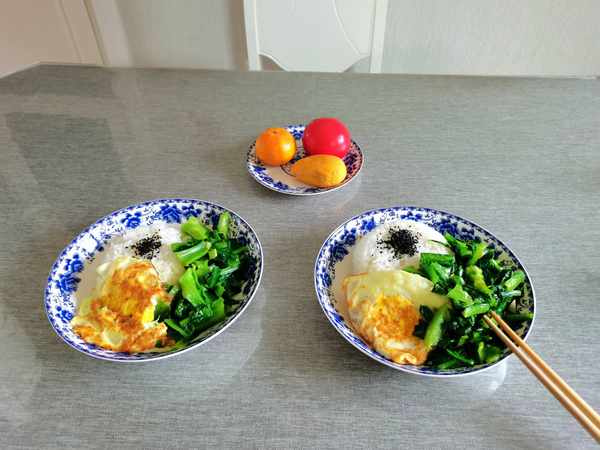 晚上預約好米飯,清洗好油麥菜,早晨先煎雞蛋,然後用煎雞蛋的鍋接著炒油麥菜,翻炒兩下菜就出鍋瞭,盛出米飯,放上油麥菜、煎雞蛋,撒點黑芝麻,美味即成。