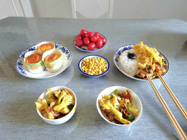 孩子每天要學習,早餐要吃好,一大盤子牛肉菜花拌米飯是孩子的,我和丈夫一人一小碗,再吃一個小蛋糕,吃點醋泡黃豆就足夠瞭。