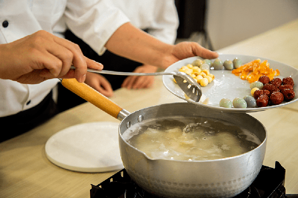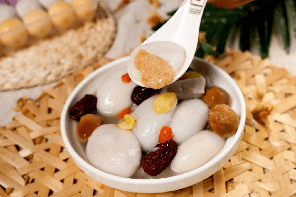 鴨母捻制成甜湯,配料多達十幾種;這也是它區別於湯圓的地方。甜湯裡除瞭鴨母捻還可搭配芋頭、番薯、銀耳、綠豆、紅豆、白果、薏米、鵪鶉蛋等小果。