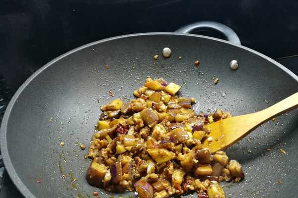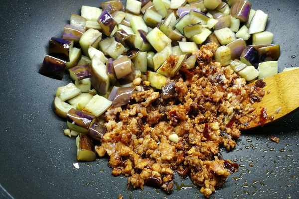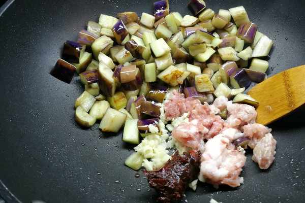 燜到收汁,茄子也就變軟瞭,哈哈,怎樣是不是很健康的做法?然後加入香辣醬和肉泥、蒜蓉