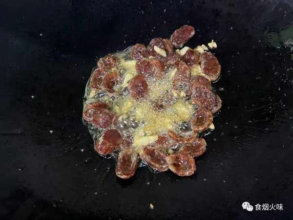 2.備好的臘肉放在清水中沖洗幹凈,臘肉洗好之後放著切小片,切好放在盆中備用。鍋裡面放入油,把它煮熱。然後我們把臘肉放入鍋中邊炒一下,炒香加入加入蒜泥炒香;