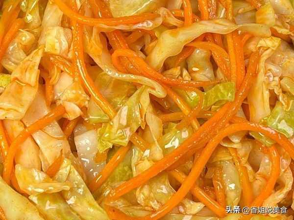 4、將涼拌醬汁倒入包菜胡蘿卜中,抓拌均勻就可以上桌開吃瞭。