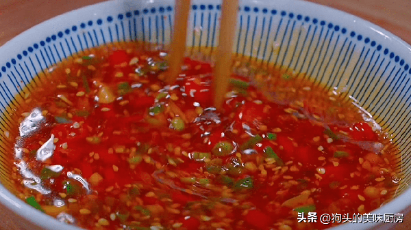 3.大蒜蔥花小米辣一勺辣椒面,放入盆中,淋入滾燙的熱油激發一下香氣。攪拌均勻。