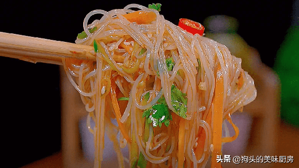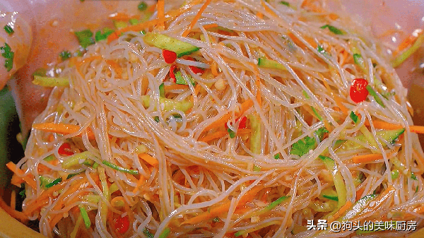 純正粉絲是用綠豆制作的,它的特點是不易斷,口感爽滑筋道,這是因為它含有最多的直鏈淀粉,久煮不爛,口感爽滑。如果吃到不易爛又爽滑的粉絲,不要覺得是黑科技,看看原材料是不是綠豆就可以瞭。這道涼拌粉絲是酸辣口味的,口味可以自由調整,喜歡吃酸的白醋或者香醋就加多點,喜歡吃辣的辣椒面跟小米辣就加多點,這些都可以自由調整。除瞭粉絲還有一些配菜,比如胡蘿卜、青瓜等等,非常清爽的口味。