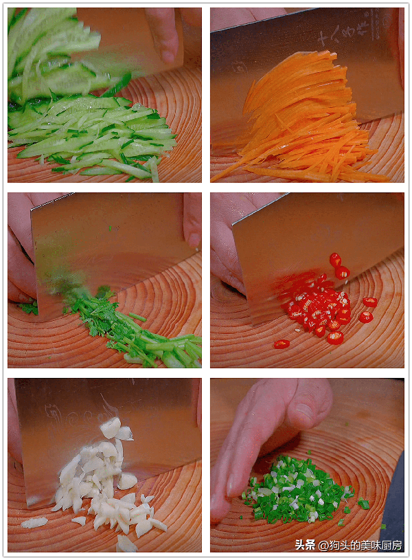 2.再準備一點配菜。青瓜切成絲、胡蘿卜切成絲、香菜切段、小米辣切圈、大蒜拍扁切碎、再切點蔥花備用。