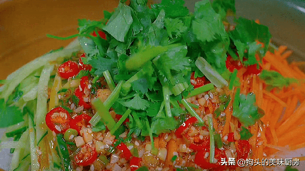 6.再把青瓜絲、胡蘿卜絲、香菜、前面調好的料汁倒進來。