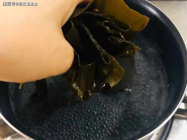 2、鍋裡燒開水,水開後下入海帶片,再下入蝦米,大火煮開,轉小火,繼續煮5分鐘左右。