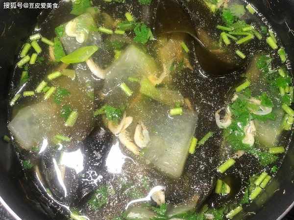 材料:海帶1把,冬瓜100克,蝦皮1把,香菜適量,鹽適量,白胡椒適量。