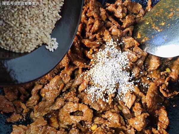 3、熄火,撒上芝麻,翻炒均勻,出鍋,撒上蔥花,完成。