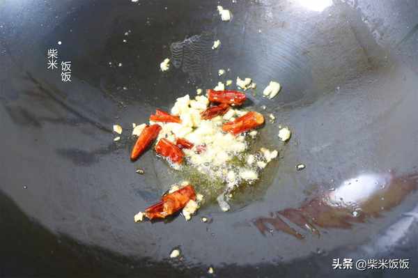 3,熱鍋涼油,放入蒜末、幹辣椒,小火炒出香味。