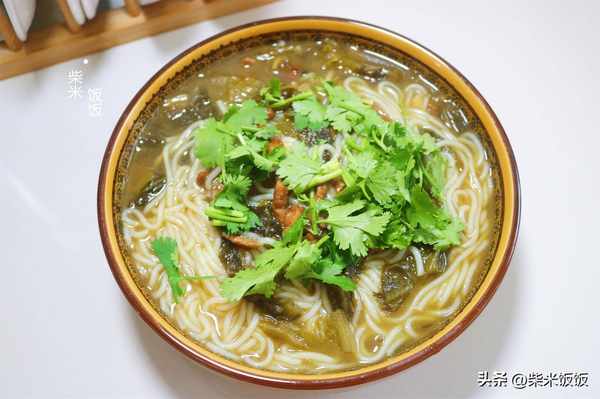 7,盛入碗中,加些香菜、香蔥或者蒜苗提鮮。一碗好吃的酸菜肉絲米粉就好瞭。